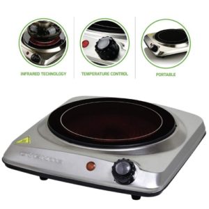 This countertop burner uses infrared technology. It is housed in flat stainless steel and features a high-quality crystallite ceramic glass top that’s easy to clean.